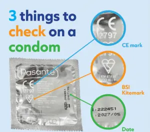 It is also super important to make sure the condom packet has either the BSI Kitemark (British Standards Institution) or the CE mark (European Economic Area.) Both of the signs essentially mean that the product has been tested by a third party, and they agree that it is safe to use.